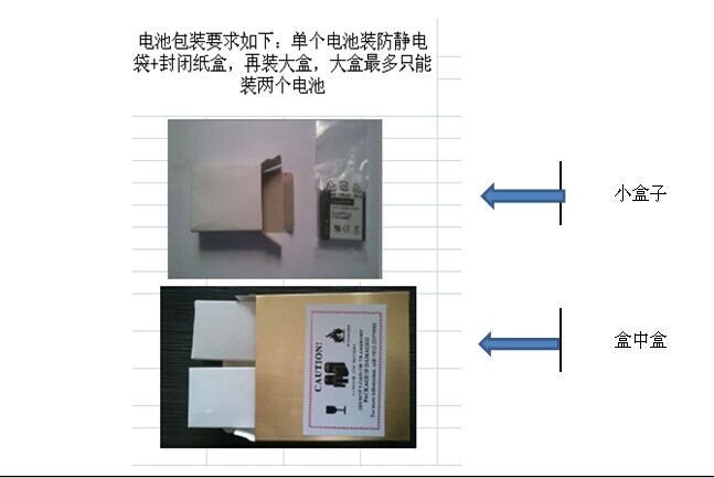 | 5.内包装:每个电池需独立包装,并且必须要用单个盒子包装;并且必须盒中盒包装,盒子上要贴防火标签; | |||||||||